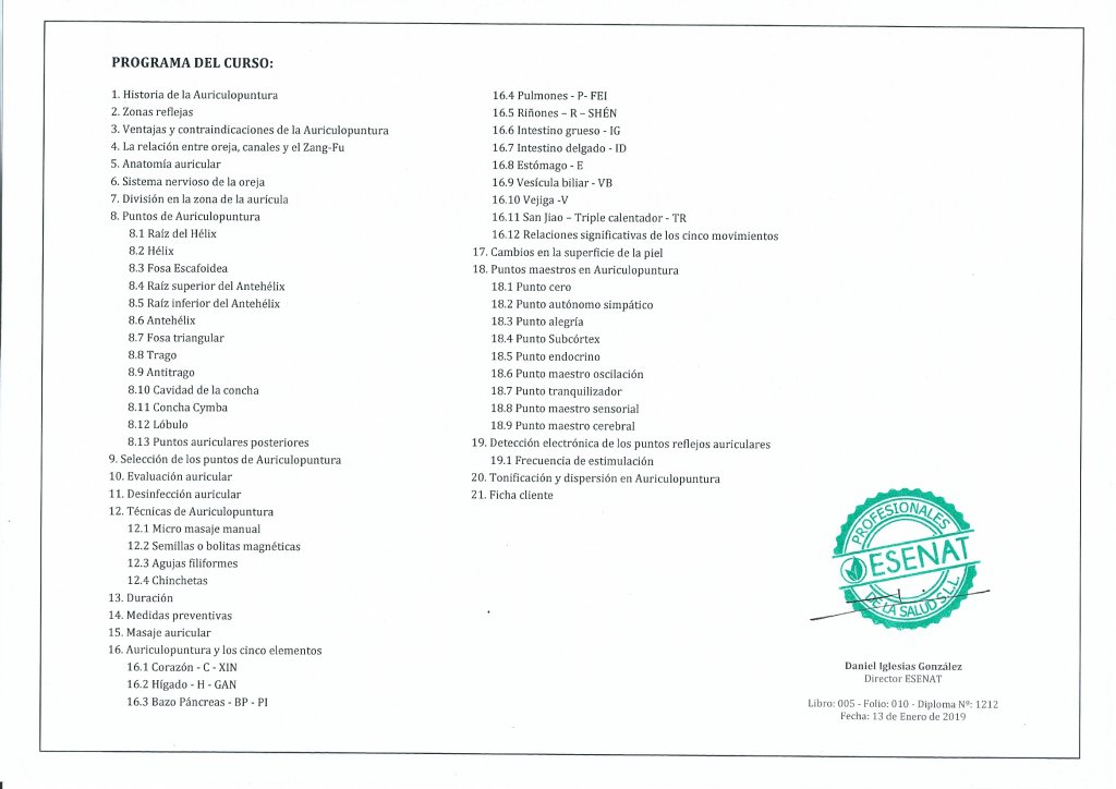 Diploma Auriculoterapia 30 horas ( ESENAT) 2018